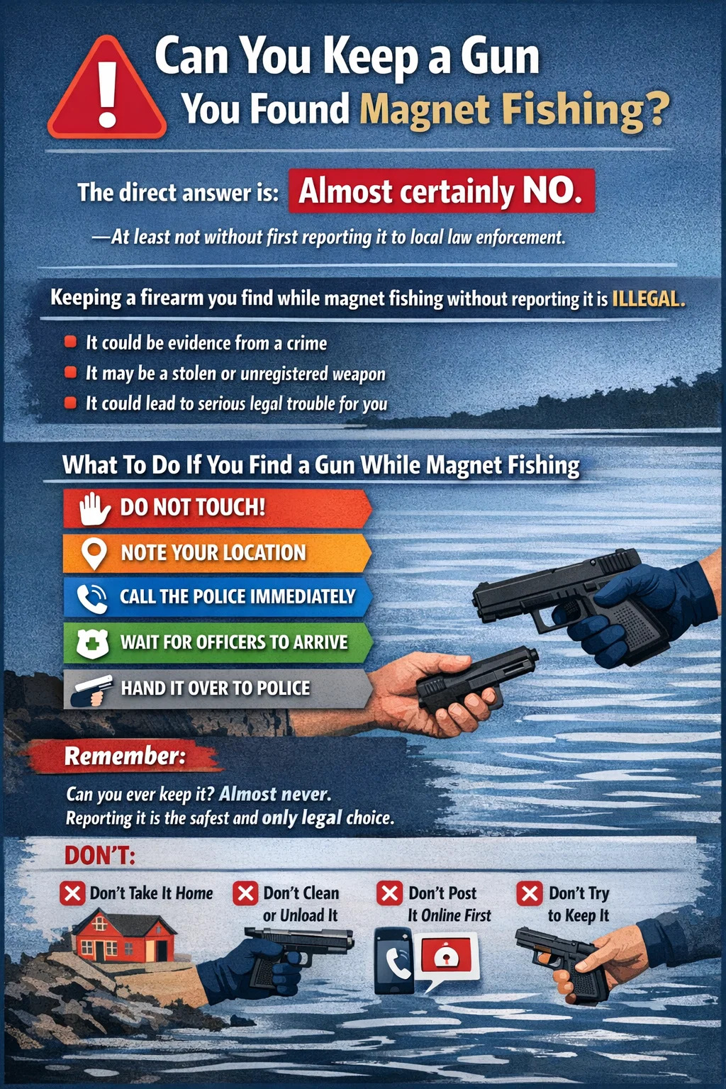 Kratak odgovor je: gotovo sigurno ne - barem ne bez prethodne prijave lokalnoj policiji. U većini američkih saveznih država, kao iu Velikoj Britaniji, Kanadi i Australiji, držanje vatrenog oružja koje ste izvukli iz vode s magnetom za pecanje bez prijave je protuzakonito. Pištolj može biti dokaz u zločinu, prijavljena krađa ili neregistrirano oružje - bilo što od toga stvara ozbiljnu pravnu izloženost za vas u trenutku kada odlučite otići s njim.