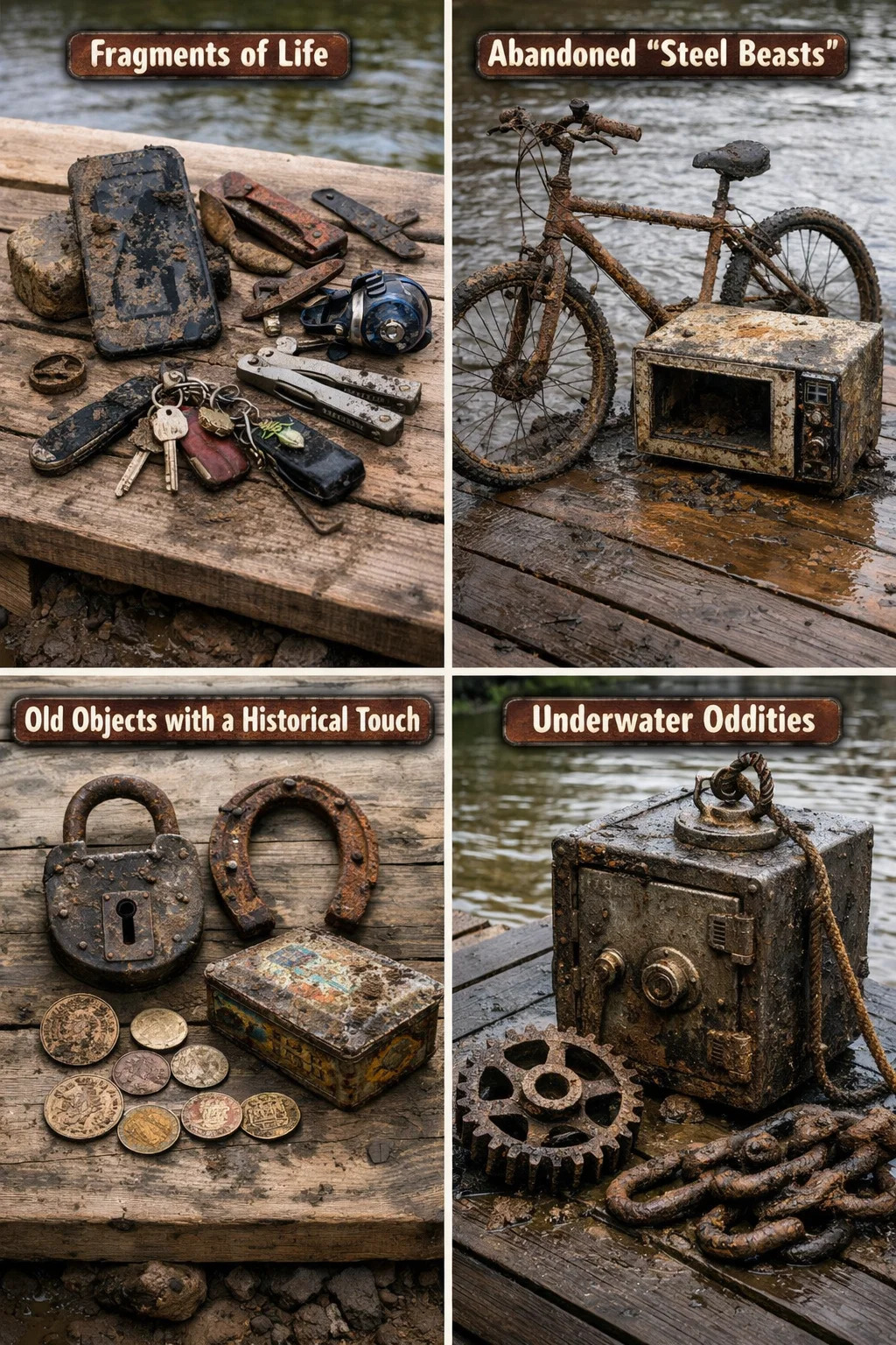 Industrijski dijelovi: ogromni zupčanici, zahrđali lanci ili neka vrsta tvorničkih dijelova strojeva čija imena više nisu prepoznatljiva. Sefovi i metalne kutije: Otkrivanje sefa često je vrhunac magnetskog ribolova, pa čak i ako sadrži samo mulj i pijesak, osjećaj postignuća iz istraživanja nepoznatog je neusporediv.