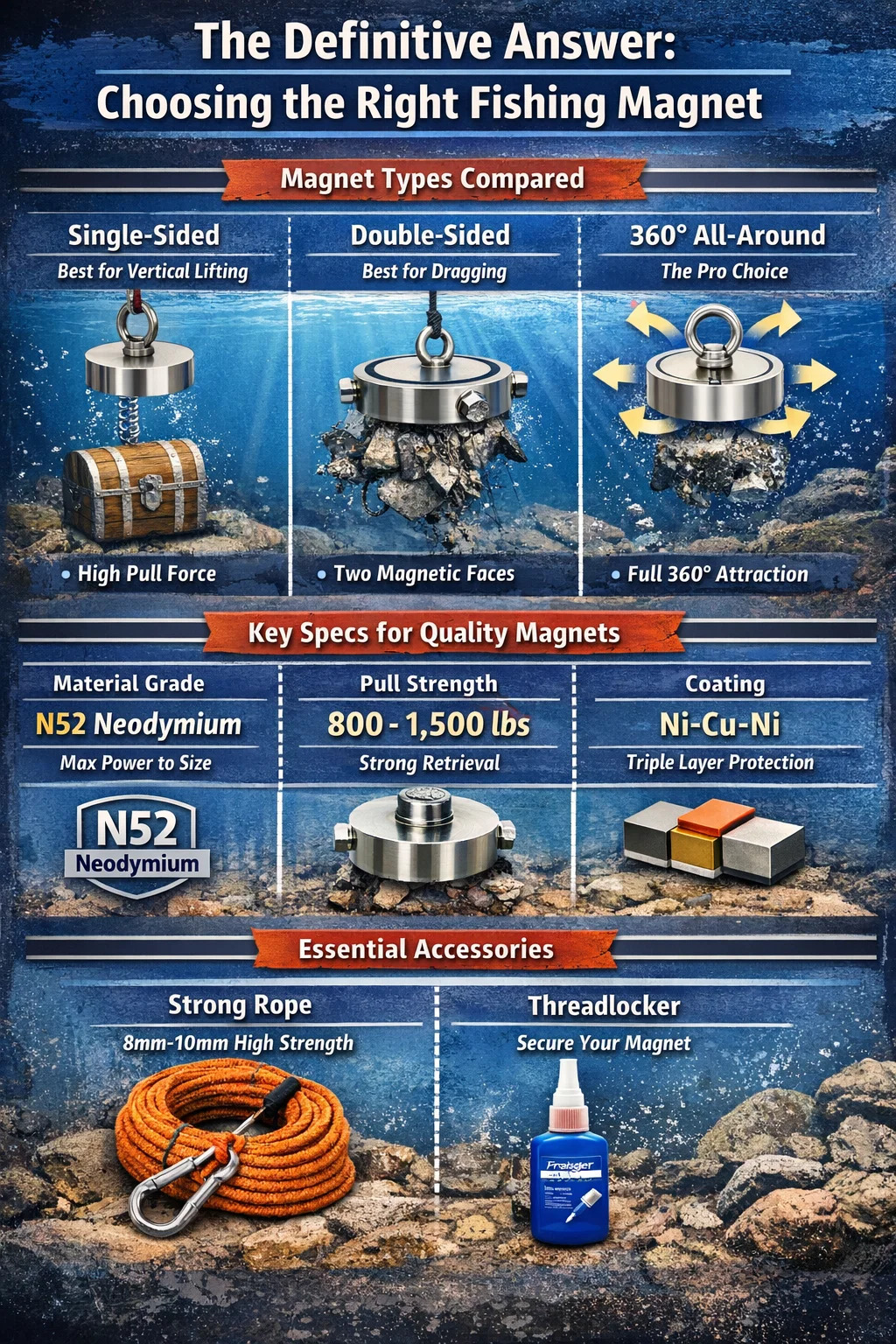 The Neodimijski magnet od 360 stupnjeva naširoko se smatra najboljim izborom za ozbiljne entuzijaste jer nudi magnetsko povlačenje iz svakog kuta, značajno povećavajući šanse za ulov. Za početnike, a dvostrani magnet za pecanje pruža najbolju ravnotežu između cijene, težine i učinkovitosti. Materijal jezgre uvijek mora biti Neodim (NdFeB) , posebno razreda N52, budući da pruža najveći omjer snage i veličine dostupan u modernoj tehnologiji.