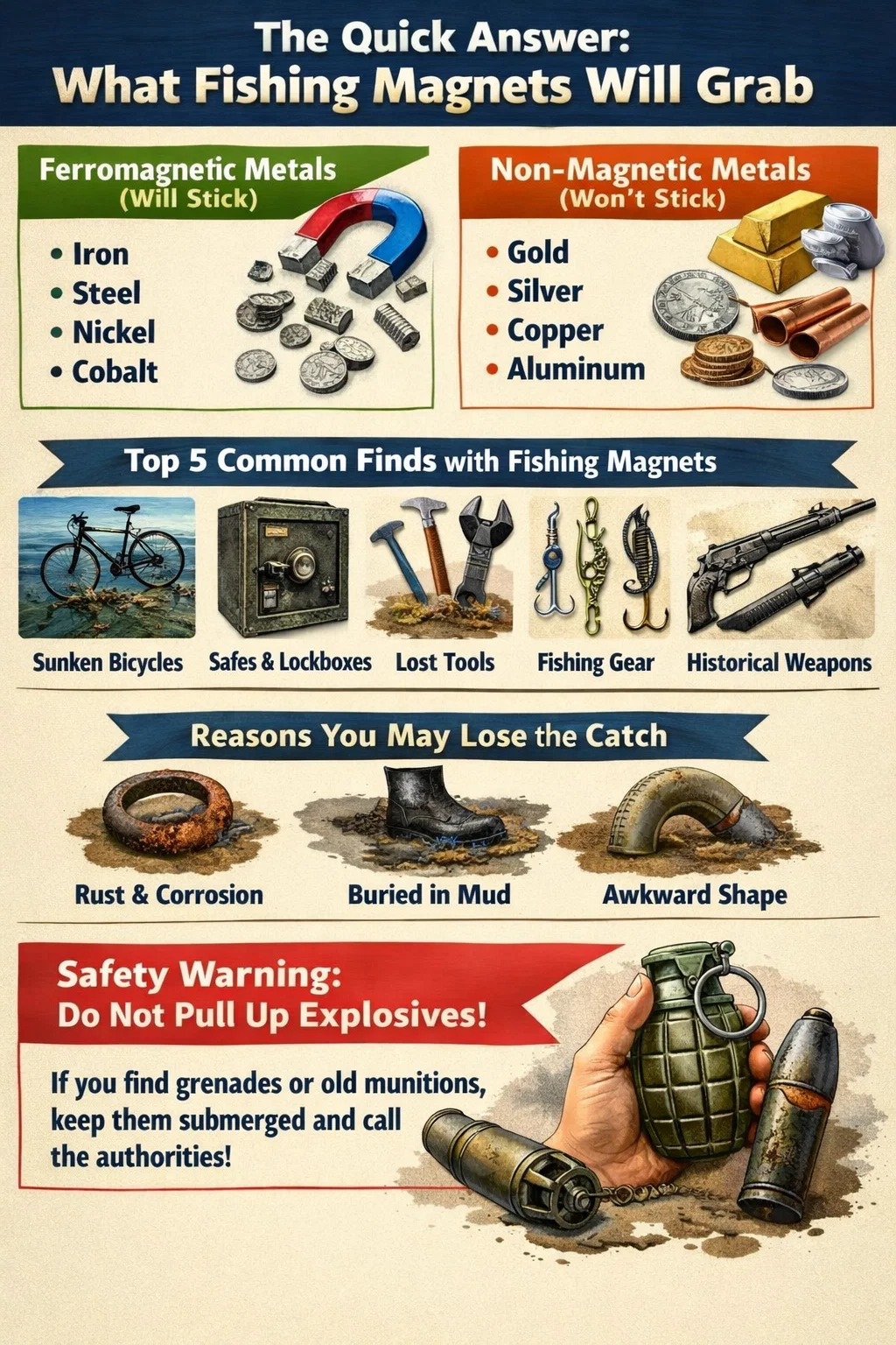 Moćan magneti za pecanje dizajnirani su za preuzimanje bilo kojeg feromagnetski materijali , koji prvenstveno uključuju željezo, čelik, nikal i kobalt. U scenarijima stvarnog svijeta, to se prevodi u beskrajnu raznolikost potopljenih objekata kao što su bicikli, alati, sefovi, kovanice koje sadrže čelične jezgre, starinsko oružje i industrijski otpad . Bitno je razumjeti da oni neće pokupiti nemagnetske metale poput čistog zlata, srebra, bakra ili aluminija.